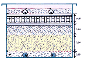 | b) Les eaux préfiltrées passent sur la totalité de la surface du lit à massif de zéolite naturelle du type chabasite, composé de deux granulométries. c) Après avoir traversé le lit à massif de zéolite, les eaux traitées passent au travers d'une grille filtrante appelée géogrille, pour éviter la migration de la zéolite avant de rejoindre une couche de gravier lavé d'une granulométrie de 20/40. d) A l'intérieur de cette couche de gravier lavé est noyé un ensemble de drains en PVC de 100 mm qui est raccordé à un regard de collecte ou de réception, pour ensuite évacuer les eaux traitées et dépolluées dans le milieu naturel. |
